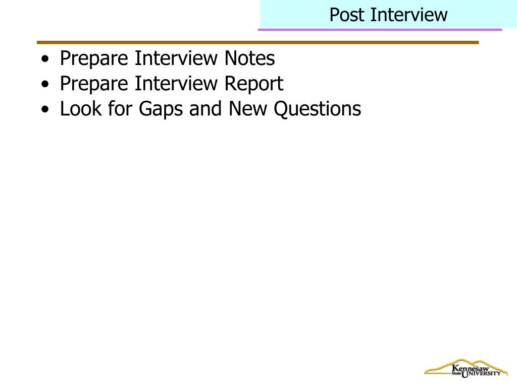 Post Interview • Prepare Interview Notes • Prepare Interview Report • Look for Gaps and New Questions