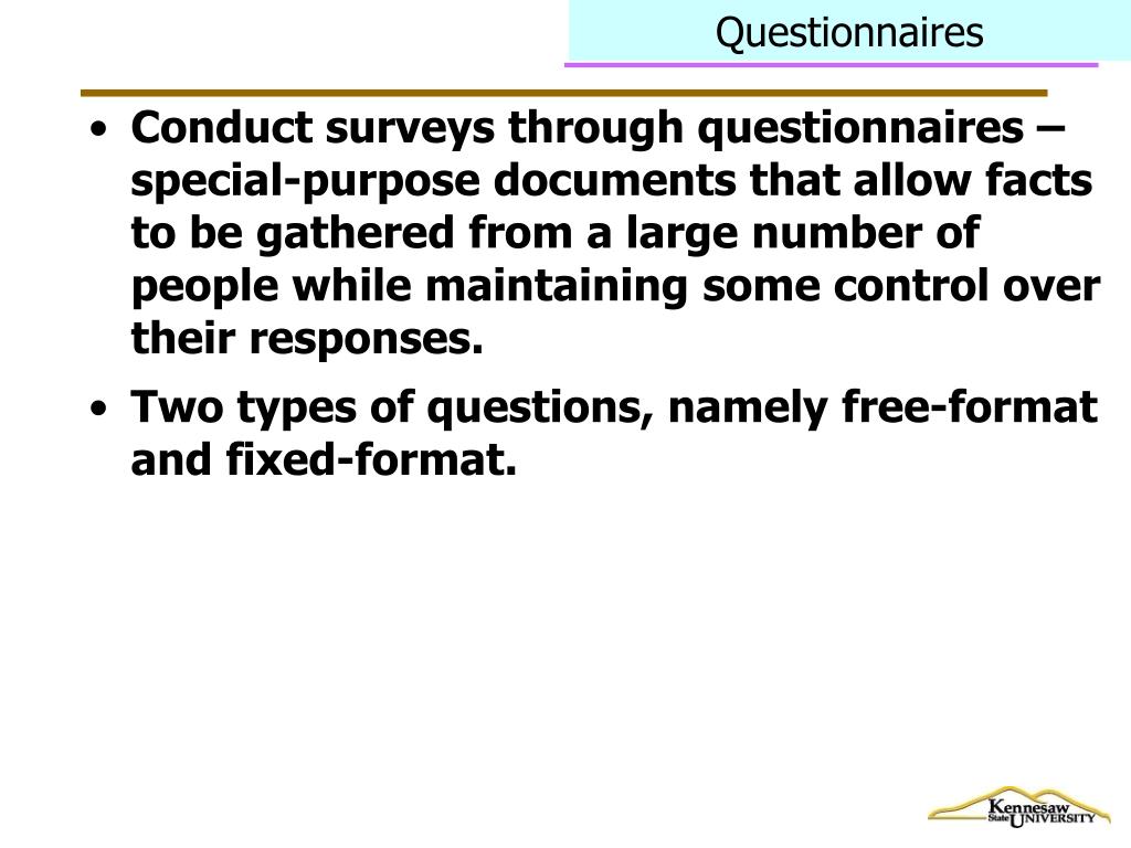 Questionnaires • Conduct surveys through questionnaires – special-purpose documents that allow facts to be gathered from a large number of people while maintaining some control over their responses. • Two types of questions, namely free-format and fixed-format.