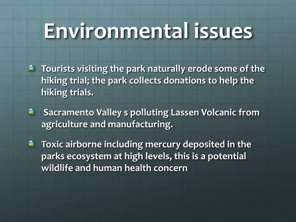 Environmental issues • Tourists visiting the park naturally erode some of the hiking trial; the park collects donations to help the hiking trials. • Sacramento Valley s polluting Lassen Volcanic from agriculture and manufacturing. • Toxic airborne including mercury deposited in the parks ecosystem at high levels, this is a potential wildlife and human health concern