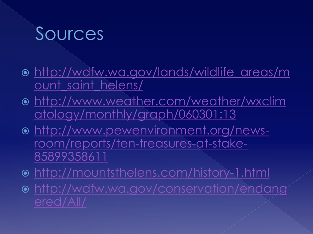 Sources • http://wdfw.wa.gov/lands/wildlife_areas/mount_saint_helens/ • http://www.weather.com/weather/wxclimatology/monthly/graph/060301:13 • http://www.pewenvironment.org/news-room/reports/ten-treasures-at-stake-85899358611 • http://mountsthelens.com/history-1.html • http://wdfw.wa.gov/conservation/endangered/All/