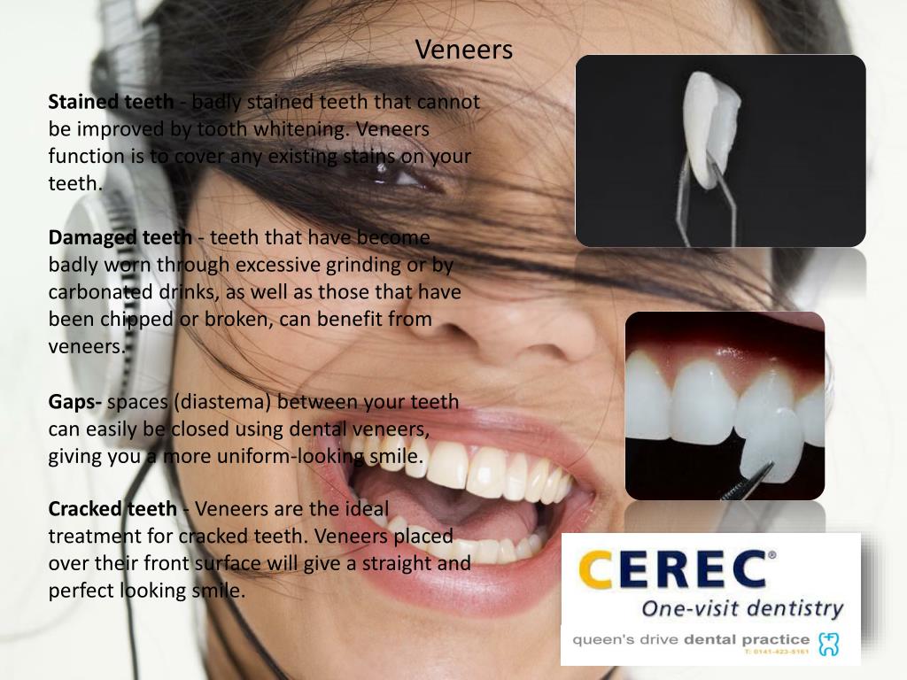 Veneers Stained teeth - badly stained teeth that cannot be improved by tooth whitening. Veneers function is to cover any existing stains on your teeth. Damaged teeth - teeth that have become badly worn through excessive grinding or by carbonated drinks, as well as those that have been chipped or broken, can benefit from veneers. Gaps- spaces (diastema) between your teeth can easily be closed using dental veneers, giving you a more uniform-looking smile. Cracked teeth - Veneers are the ideal treatment for cracked teeth. Veneers placed over their front surface will give a straight and perfect looking smile.