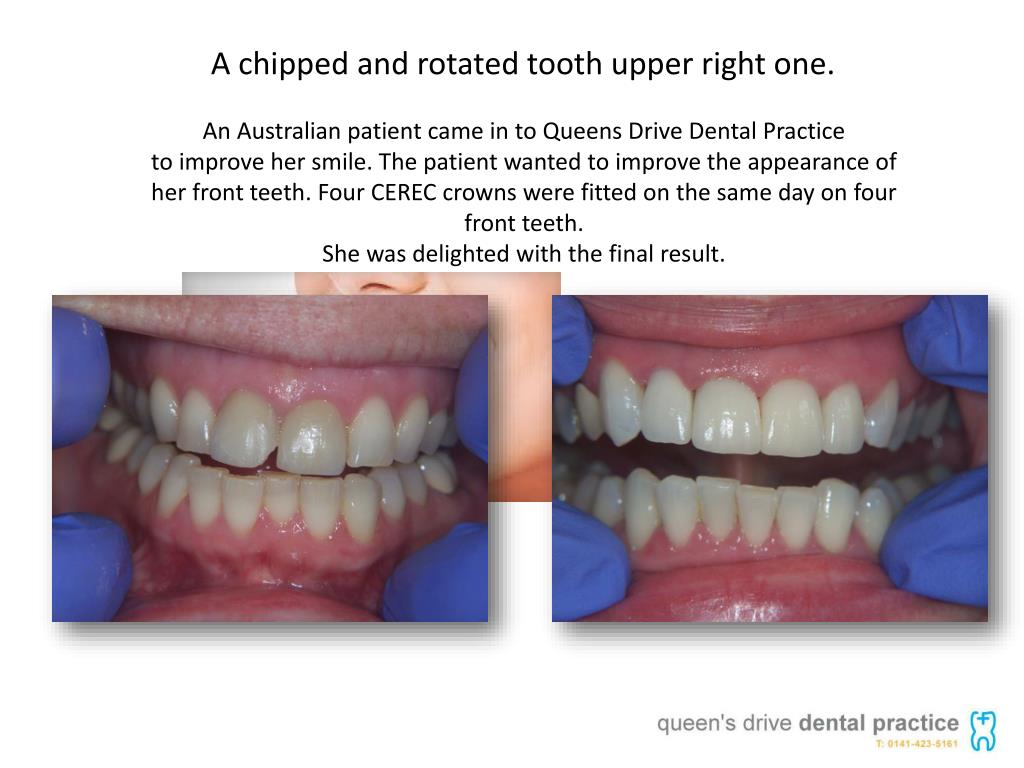 A chipped and rotated tooth upper right one. An Australian patient came in to Queens Drive Dental Practice to improve her smile. The patient wanted to improve the appearance of her front teeth. Four CEREC crowns were fitted on the same day on four front teeth. She was delighted with the final result.