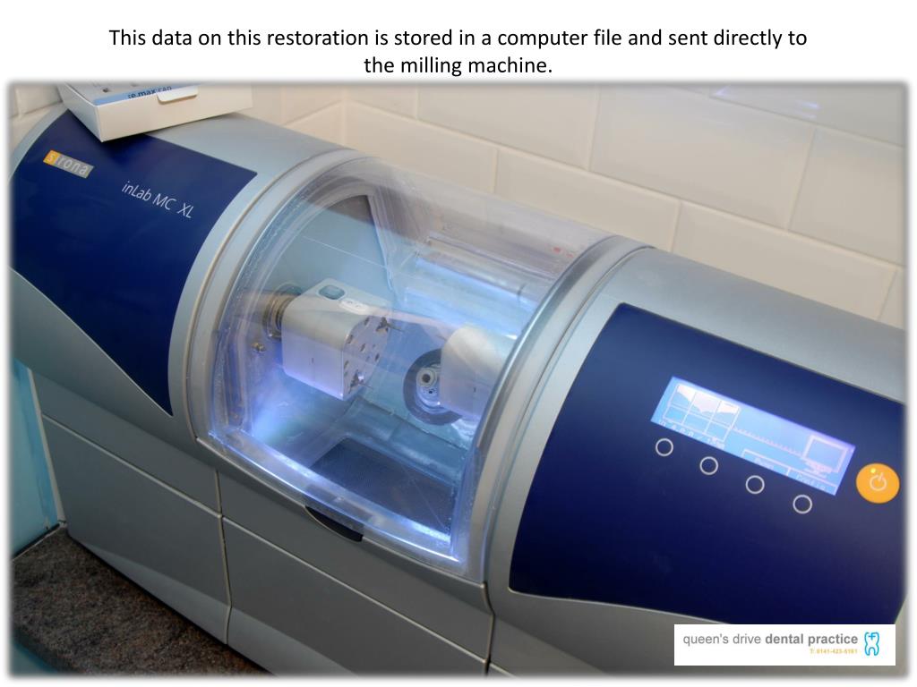 This data on this restoration is stored in a computer file and sent directly to the milling machine.
