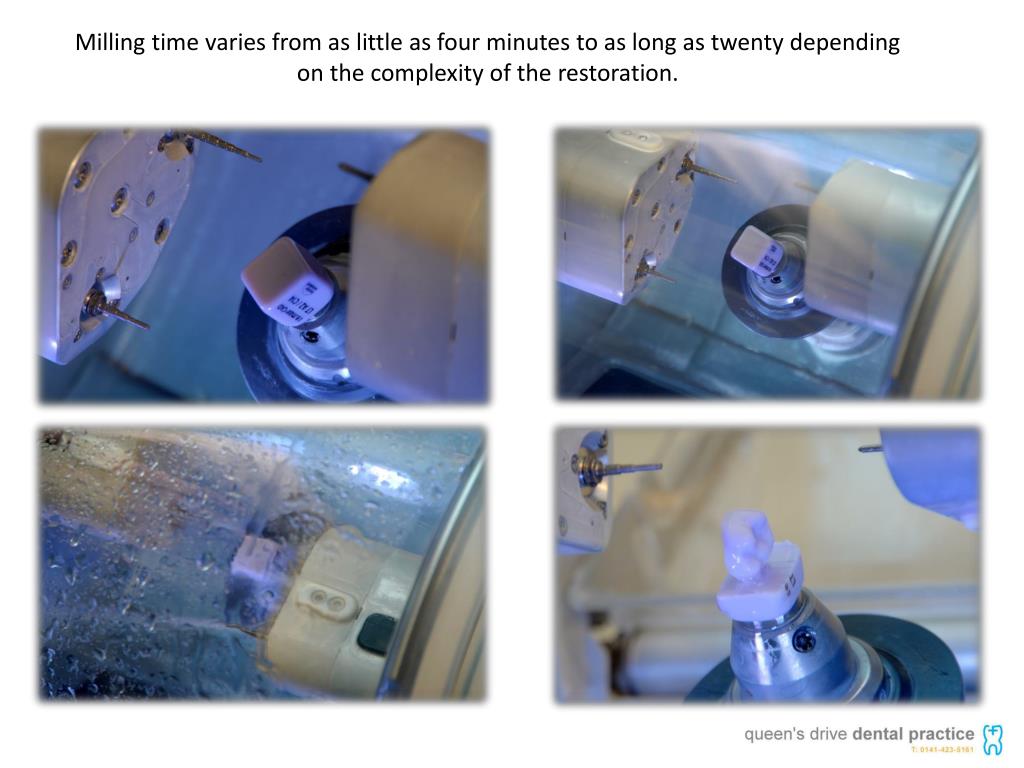 Milling time varies from as little as four minutes to as long as twenty depending on the complexity of the restoration.