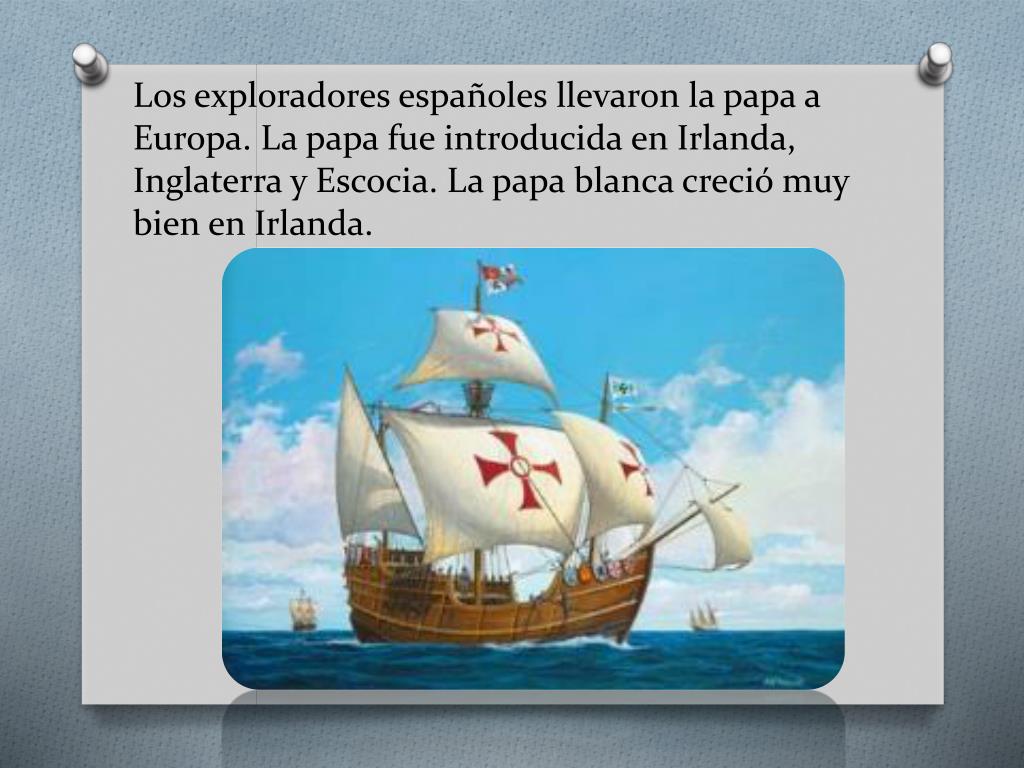 Los exploradoresespañolesllevaron la papa a Europa. La papa fueintroducida en Irlanda, Inglaterra y Escocia. La papa blancacreciómuybien en Irlanda.