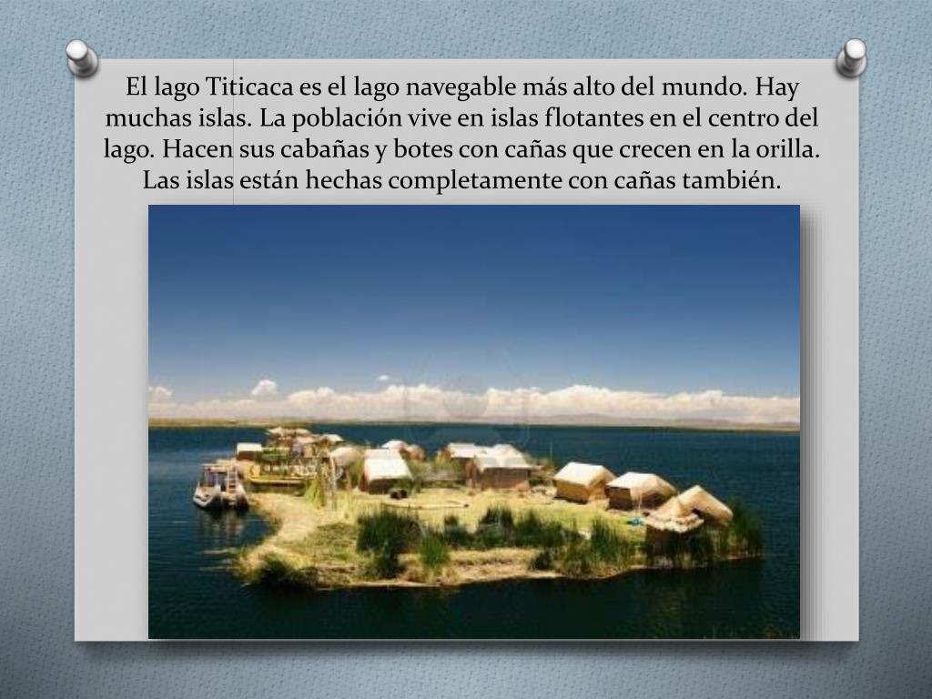 El lago Titicaca es el lagonavegablemás alto del mundo. Hay muchasislas. La población vive en islasflotantes en el centro del lago. Hacensus cabañas y botes con cañasquecrecen en la orilla. Las islasestánhechascompletamente con cañastambién.