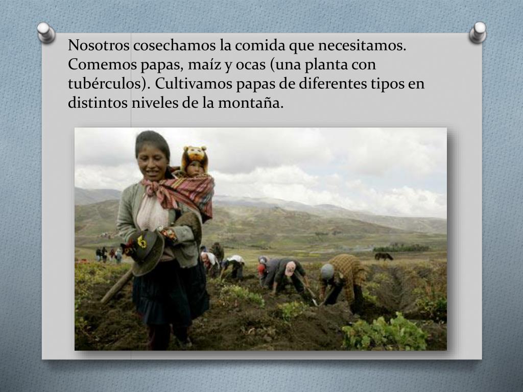 Nosotroscosechamos la comida quenecesitamos. Comemos papas, maízy ocas (unaplanta con tubérculos). Cultivamos papas de diferentestipos en distintosniveles de la montaña.
