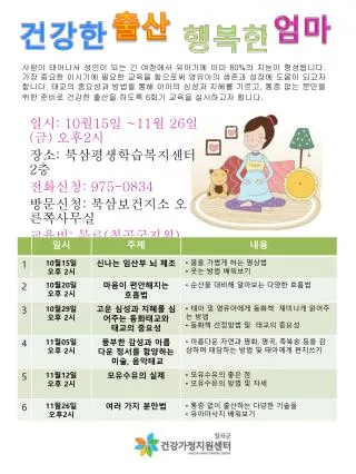 출산. 엄마. 행복한. 건강한. 사람이 태어나서 성인이 되는 긴 여정에서 유아기에 이미 80% 의 지능이 형성됩니다 . 가장 중요한 이시기에 필요한 교육을 함으로써 영유아의 생존과 성장에 도움이 되고자 합니다 . 태교의 중요성과 방법을 통해 아이의 심성과 지혜를 기르고 , 통증 없는 분만을 위한 준비로 건강한 출산을 하도록 6 회기 교육을 실시하고자 합니다. 일시 : 10 월 15 일 ~11 월 26 일 ( 금 ) 오후 2 시 장소 : 북삼평생학습복지센터 2 층 전화신청 : 975-0834