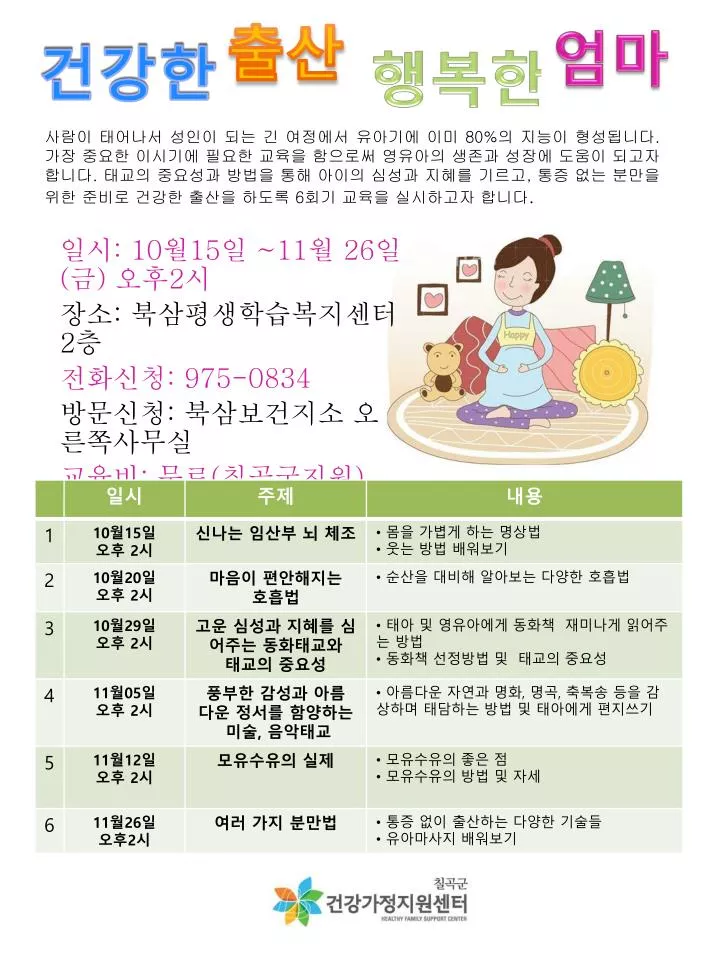 출산 엄마 행복한 건강한 사람이 태어나서 성인이 되는 긴 여정에서 유아기에 이미 80%의 지능이 형성됩니다. 가장 중요한 이시기에 필요한 교육을 함으로써 영유아의 생존과 성장에 도움이 되고자 합니다. 태교의 중요성과 방법을 통해 아이의 심성과 지혜를 기르고, 통증 없는 분만을 위한 준비로 건강한 출산을 하도록 6회기 교육을 실시하고자 합니다. 일시: 10월15일 ~11월 26일(금) 오후2시 장소: 북삼평생학습복지센터2층 전화신청: 975-0834 방문신청: 북삼보건지소 오른쪽사무실 교육비: 무료(칠곡군지원) 대상: 임산부 및 모유수유 원하는 엄마