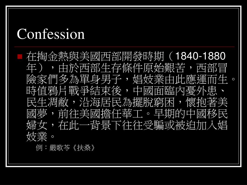 Confession • 在掏金熱與美國西部開發時期(1840-1880年),由於西部生存條件原始艱苦,西部冒險家們多為單身男子,娼妓業由此應運而生。時值鴉片戰爭結束後,中國面臨內憂外患、民生凋敝,沿海居民為擺脫窮困,懷抱著美國夢,前往美國擔任華工。早期的中國移民婦女,在此一背景下往往受騙或被迫加入娼妓業。 例:嚴歌苓《扶桑》
