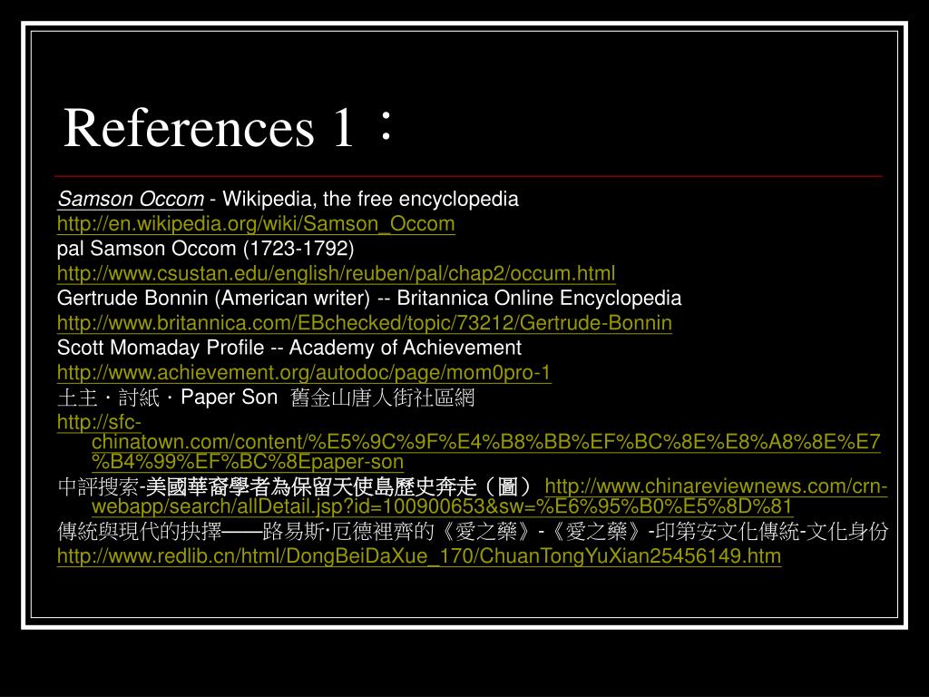 References 1: Samson Occom - Wikipedia, the free encyclopedia http://en.wikipedia.org/wiki/Samson_Occom pal Samson Occom (1723-1792) http://www.csustan.edu/english/reuben/pal/chap2/occum.html Gertrude Bonnin (American writer) -- Britannica Online Encyclopedia http://www.britannica.com/EBchecked/topic/73212/Gertrude-Bonnin Scott Momaday Profile -- Academy of Achievement http://www.achievement.org/autodoc/page/mom0pro-1 土主.討紙.Paper Son 舊金山唐人街社區網 http://sfc-chinatown.com/content/%E5%9C%9F%E4%B8%BB%EF%BC%8E%E8%A8%8E%E7%B4%99%EF%BC%8Epaper-son 中評搜索-美國華裔學者為保留天使島歷史奔走(圖)http://www.chinareviewnews.com/crn-webapp/search/allDetail.jsp?id=100900653&sw=%E6%95%B0%E5%8D%81 傳統與現代的抉擇——路易斯·厄德裡齊的《愛之藥》-《愛之藥》-印第安文化傳統-文化身份 http://www.redlib.cn/html/DongBeiDaXue_170/ChuanTongYuXian25456149.htm