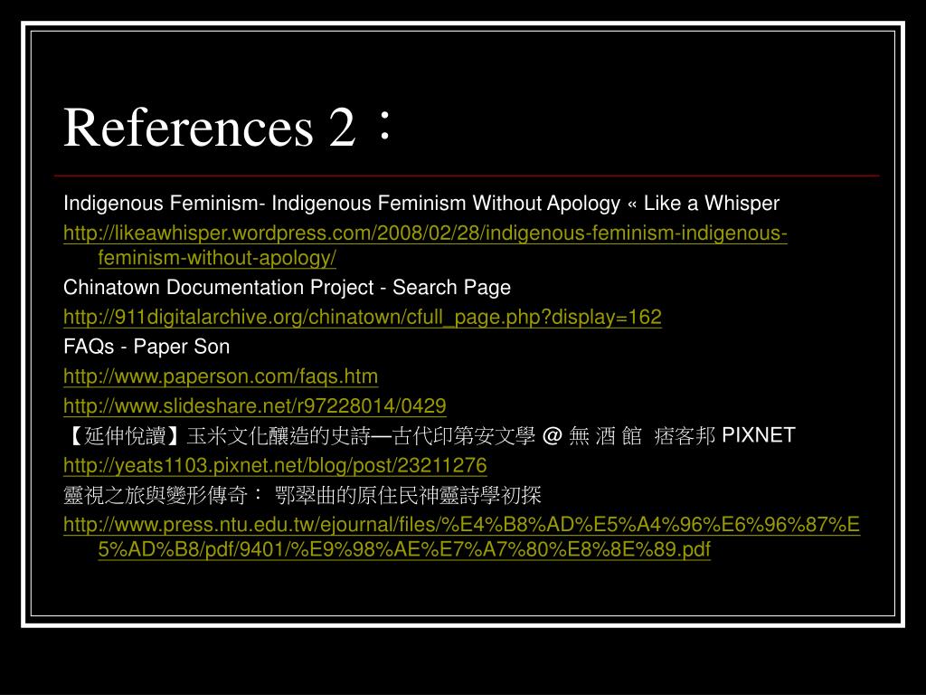 References 2: Indigenous Feminism- Indigenous Feminism Without Apology « Like a Whisper http://likeawhisper.wordpress.com/2008/02/28/indigenous-feminism-indigenous-feminism-without-apology/ Chinatown Documentation Project - Search Page http://911digitalarchive.org/chinatown/cfull_page.php?display=162 FAQs - Paper Son http://www.paperson.com/faqs.htm http://www.slideshare.net/r97228014/0429 【延伸悅讀】玉米文化釀造的史詩—古代印第安文學 @ 無 酒 館 痞客邦 PIXNET http://yeats1103.pixnet.net/blog/post/23211276 靈視之旅與變形傳奇: 鄂翠曲的原住民神靈詩學初探 http://www.press.ntu.edu.tw/ejournal/files/%E4%B8%AD%E5%A4%96%E6%96%87%E5%AD%B8/pdf/9401/%E9%98%AE%E7%A7%80%E8%8E%89.pdf