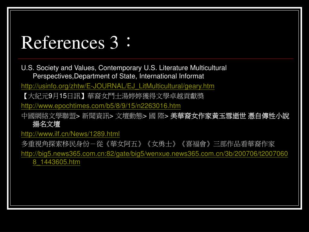 References 3: U.S. Society and Values, Contemporary U.S. Literature Multicultural Perspectives,Department of State, International Informat http://usinfo.org/zhtw/E-JOURNAL/EJ_LitMulticultural/geary.htm 【大紀元9月15日訊】華裔女鬥士湯婷婷獲得文學卓越貢獻獎 http://www.epochtimes.com/b5/8/9/15/n2263016.htm 中國網絡文學聯盟> 新聞資訊> 文壇動態> 國 際> 美華裔女作家黃玉雪逝世 憑自傳性小說揚名文壇 http://www.ilf.cn/News/1289.html 多重視角探索移民身份-從《華女阿五》《女勇士》《喜福會》三部作品看華裔作家 http://big5.news365.com.cn:82/gate/big5/wenxue.news365.com.cn/3b/200706/t20070608_1443605.htm