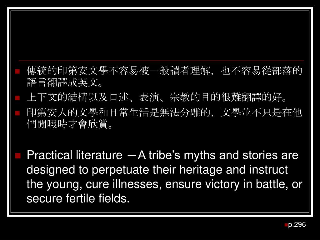 傳統的印第安文學不容易被一般讀者理解,也不容易從部落的語言翻譯成英文。傳統的印第安文學不容易被一般讀者理解,也不容易從部落的語言翻譯成英文。 • 上下文的結構以及口述、表演、宗教的目的很難翻譯的好。 • 印第安人的文學和日常生活是無法分離的,文學並不只是在他們閒暇時才會欣賞。 • Practical literature -A tribe’s myths and stories are designed to perpetuate their heritage and instruct the young, cure illnesses, ensure victory in battle, or secure fertile fields. • p.296