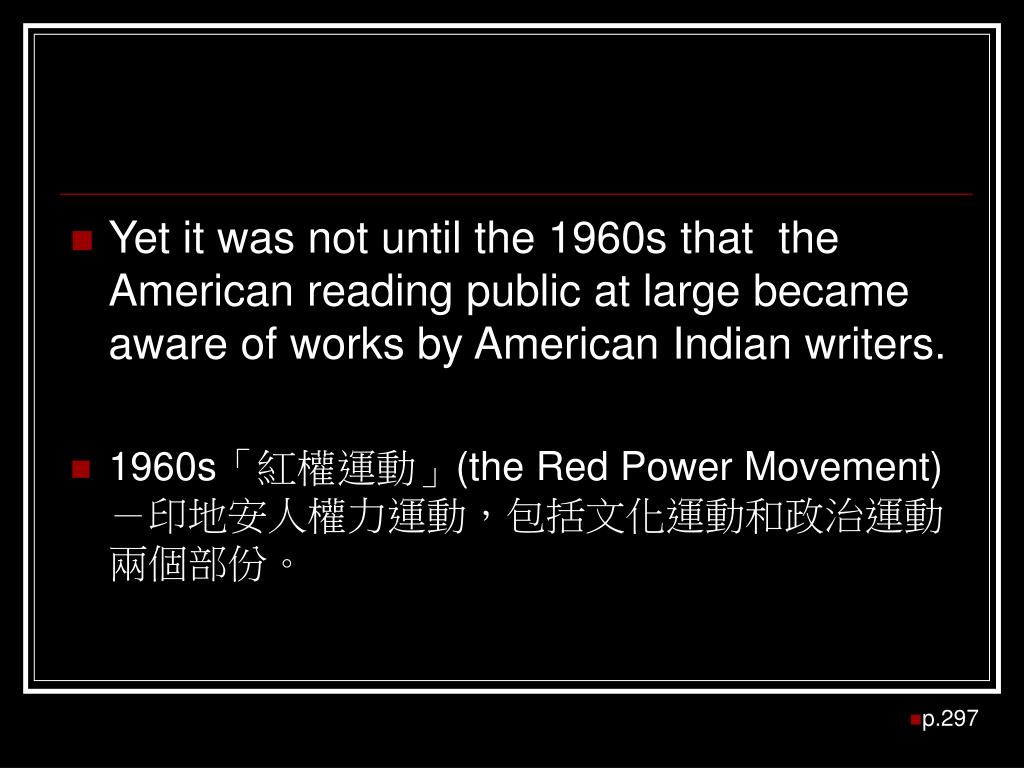 Yet it was not until the 1960s that the American reading public at large became aware of works by American Indian writers. • 1960s「紅權運動」(the Red Power Movement)-印地安人權力運動,包括文化運動和政治運動兩個部份。 • p.297