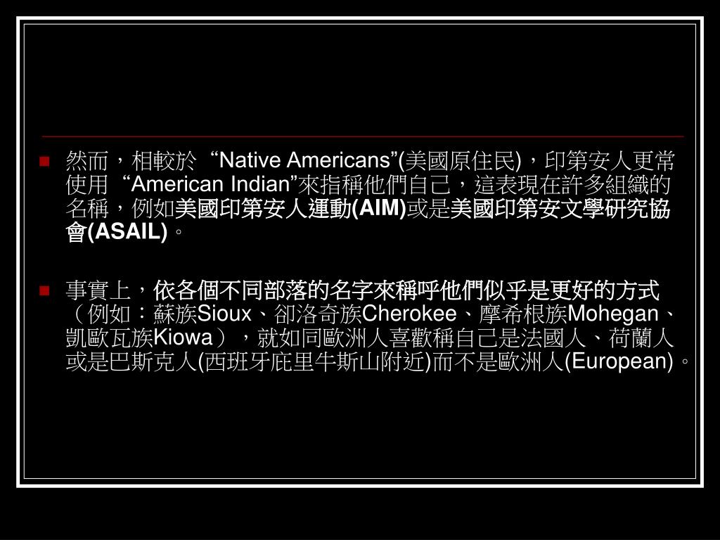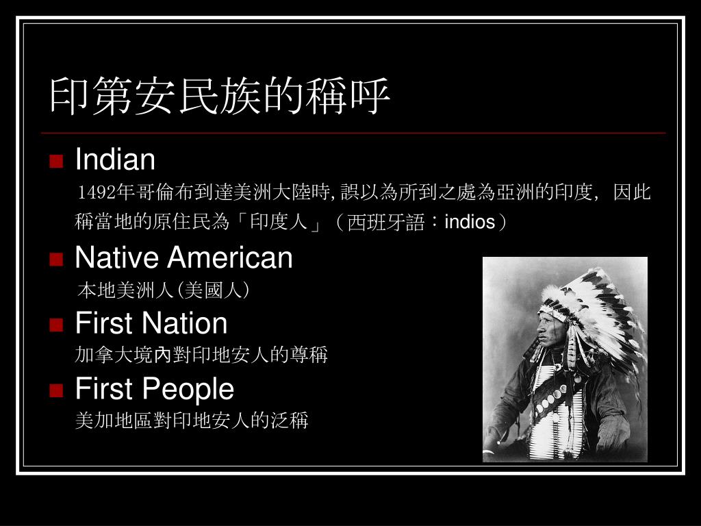 印第安民族的稱呼 • Indian 1492年哥倫布到達美洲大陸時,誤以為所到之處為亞洲的印度,因此稱當地的原住民為「印度人」(西班牙語:indios) • Native American 本地美洲人(美國人) • First Nation 加拿大境內對印地安人的尊稱 • First People 美加地區對印地安人的泛稱