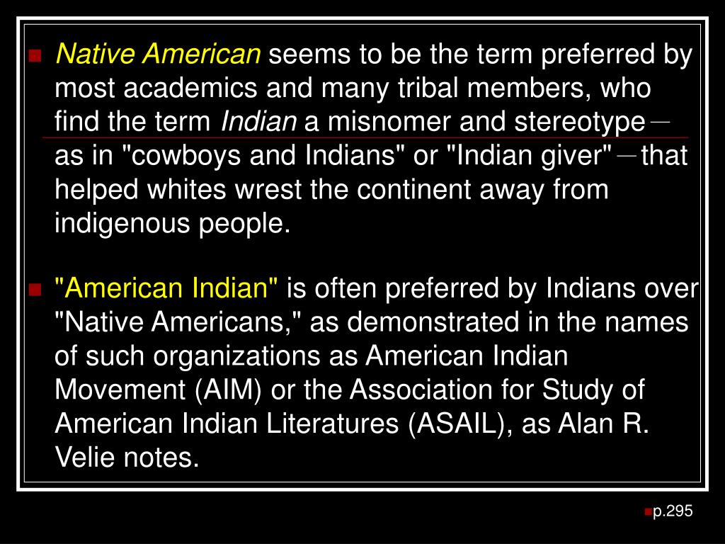 Native Americanseems to be the term preferred by most academics and many tribal members, who find the term Indian a misnomer and stereotype-as in "cowboys and Indians" or "Indian giver"-that helped whites wrest the continent away from indigenous people. • "American Indian" is often preferred by Indians over "Native Americans," as demonstrated in the names of such organizations as American Indian Movement (AIM) or the Association for Study of American Indian Literatures (ASAIL), as Alan R. Velie notes. • p.295
