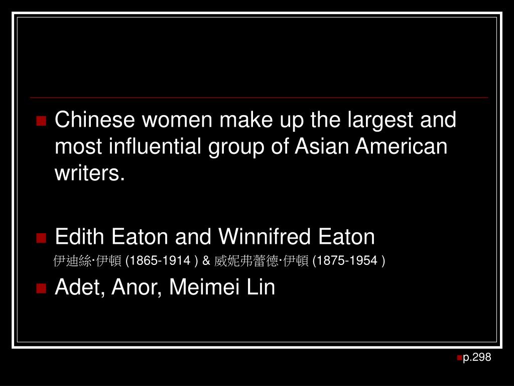 Chinese women make up the largest and most influential group of Asian American writers. • Edith Eaton and Winnifred Eaton 伊迪絲·伊頓 (1865-1914 ) & 威妮弗蕾德·伊頓 (1875-1954 ) • Adet, Anor, Meimei Lin • p.298