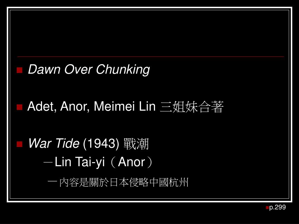 Dawn Over Chunking • Adet, Anor, Meimei Lin 三姐妹合著 • War Tide (1943) 戰潮 -Lin Tai-yi(Anor) -內容是關於日本侵略中國杭州 • p.299