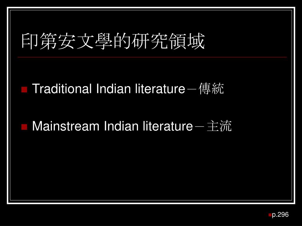 印第安文學的研究領域 • Traditional Indian literature-傳統 • Mainstream Indian literature-主流 • p.296