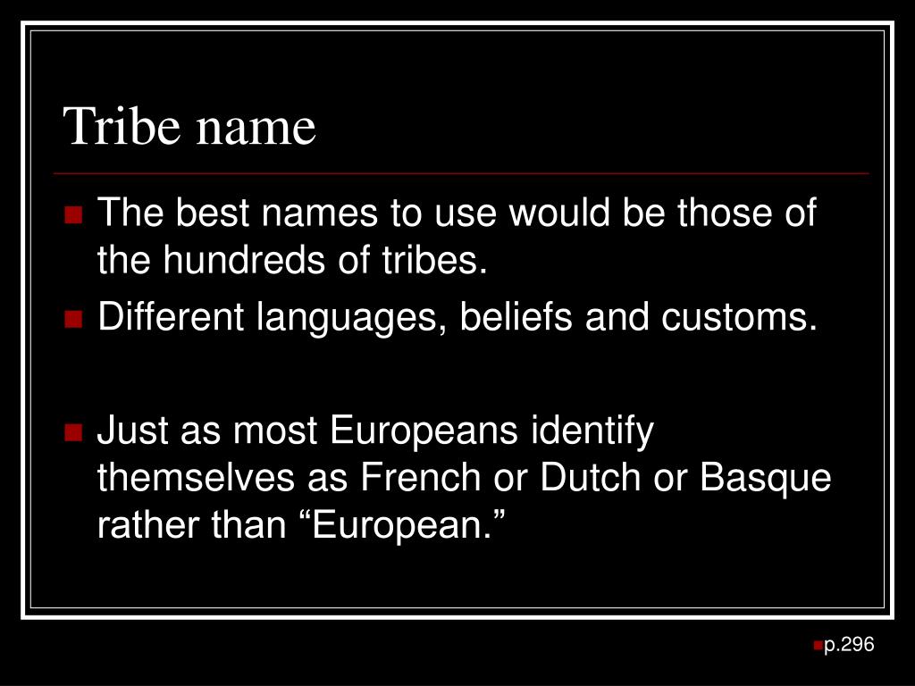 Tribe name • The best names to use would be those of the hundreds of tribes. • Different languages, beliefs and customs. • Just as most Europeans identify themselves as French or Dutch or Basque rather than “European.” • p.296