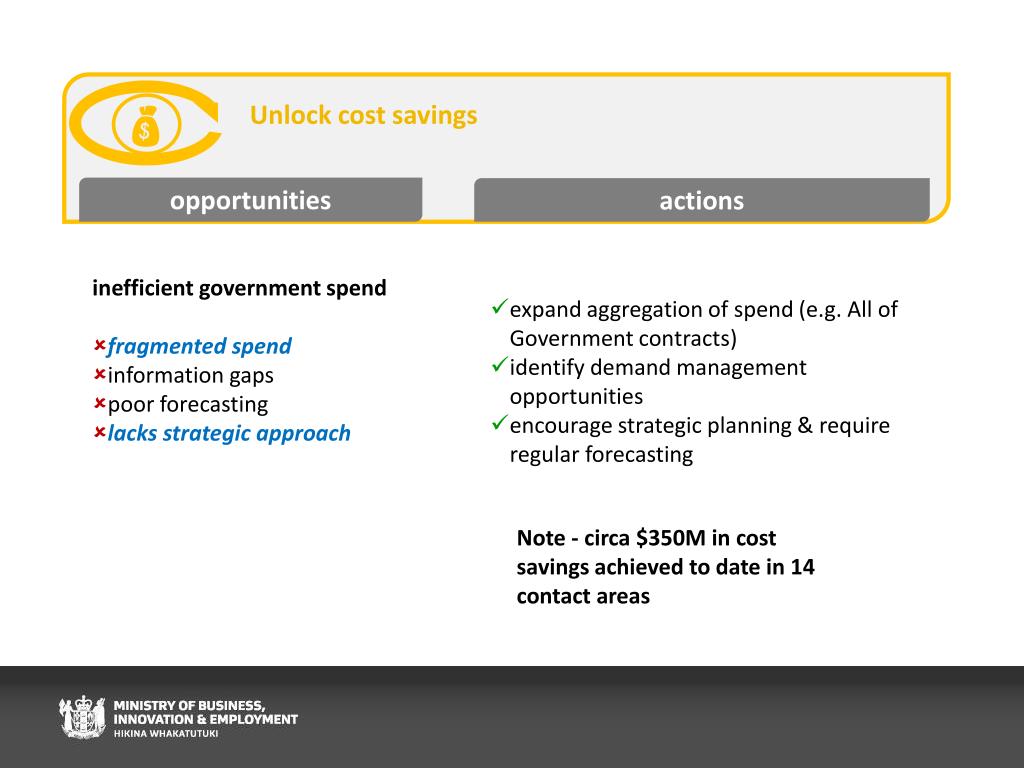 Note - circa $350M in cost savings achieved to date in 14 contact areas Unlock cost savings opportunities actions • inefficient government spend • fragmented spend • information gaps • poor forecasting • lacks strategic approach • expand aggregation of spend (e.g. All of Government contracts) • identify demand management opportunities • encourage strategic planning & require regular forecasting