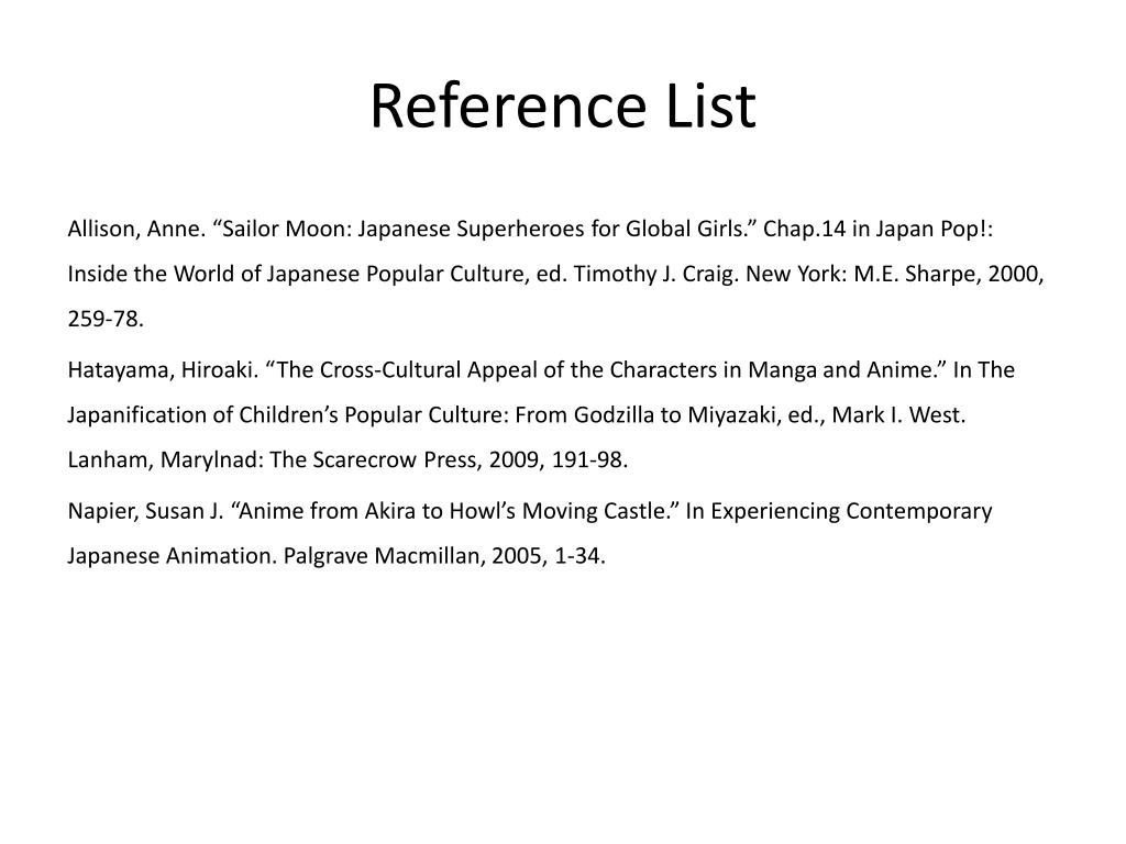 Reference List Allison, Anne. “Sailor Moon: Japanese Superheroes for Global Girls.” Chap.14 in Japan Pop!: Inside the World of Japanese Popular Culture, ed. Timothy J. Craig. New York: M.E. Sharpe, 2000, 259-78. Hatayama, Hiroaki. “The Cross-Cultural Appeal of the Characters in Manga and Anime.” In The Japanification of Children’s Popular Culture: From Godzilla to Miyazaki, ed., Mark I. West. Lanham, Marylnad: The Scarecrow Press, 2009, 191-98. Napier, Susan J. “Anime from Akira to Howl’s Moving Castle.” In Experiencing Contemporary Japanese Animation. Palgrave Macmillan, 2005, 1-34.
