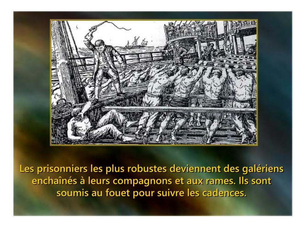 Les prisonniers les plus robustes deviennent des galériens enchaînés à leurs compagnons et aux rames. Ils sont soumis au fouet pour suivre les cadences.