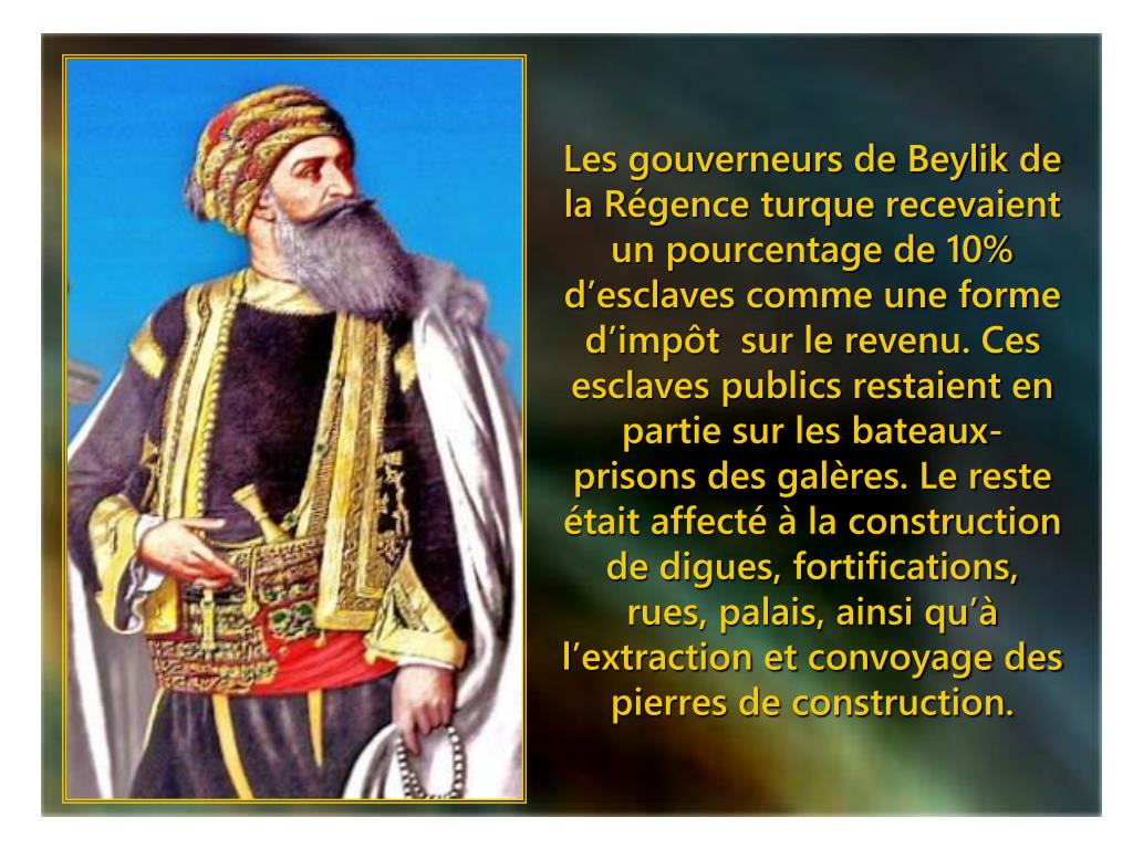 Les gouverneurs de Beylik de la Régence turque recevaient un pourcentage de 10% d’esclaves comme une forme d’impôt sur le revenu. Ces esclaves publics restaient en partie sur les bateaux-prisons des galères. Le reste était affecté à la construction de digues, fortifications, rues, palais, ainsi qu’à l’extraction et convoyage des pierres de construction.
