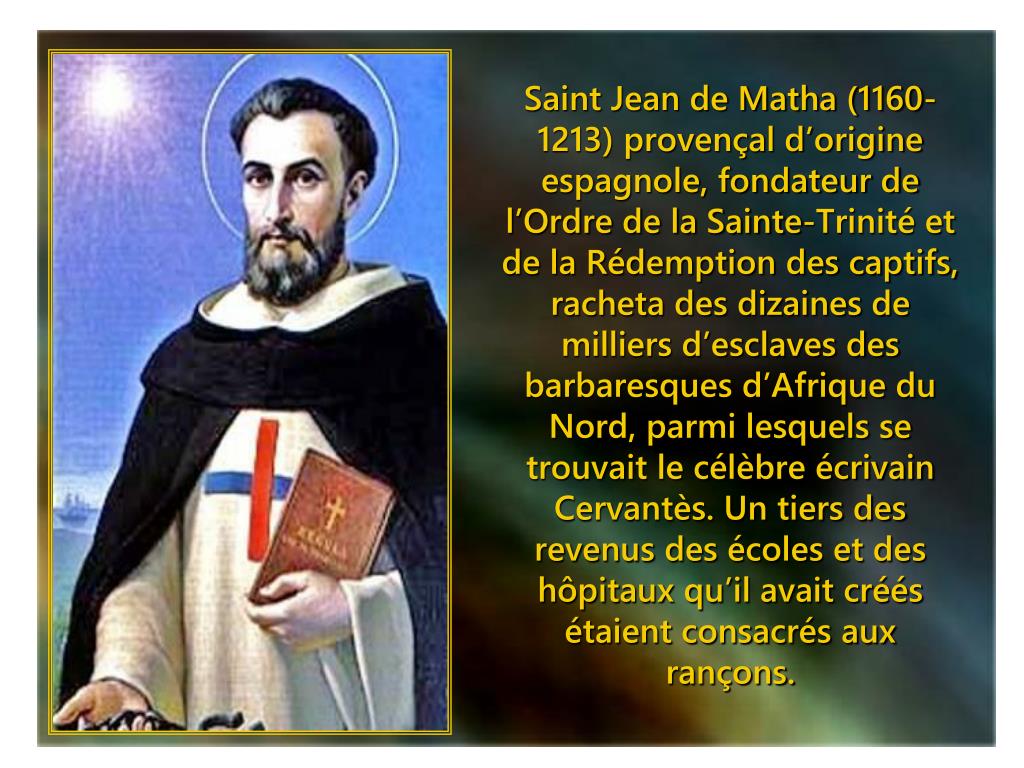 Saint Jean de Matha (1160-1213) provençal d’origine espagnole, fondateur de l’Ordre de la Sainte-Trinité et de la Rédemption des captifs, racheta des dizaines de milliers d’esclaves des barbaresques d’Afrique du Nord, parmi lesquels se trouvait le célèbre écrivain Cervantès. Un tiers des revenus des écoles et des hôpitaux qu’il avait créés étaient consacrés aux rançons.