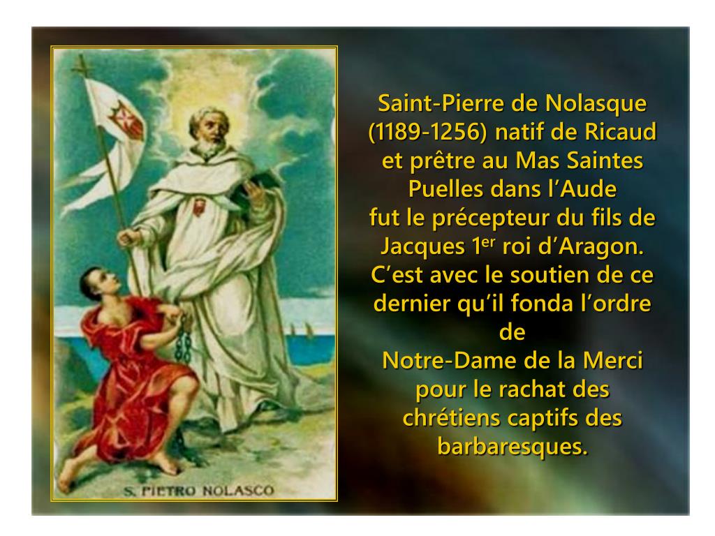 Saint-Pierre de Nolasque (1189-1256) natif de Ricaud et prêtre au Mas Saintes Puelles dans l’Audefut le précepteur du fils de Jacques 1er roi d’Aragon. C’est avec le soutien de ce dernier qu’il fonda l’ordre de Notre-Dame de la Merci pour le rachat des chrétiens captifs des barbaresques.
