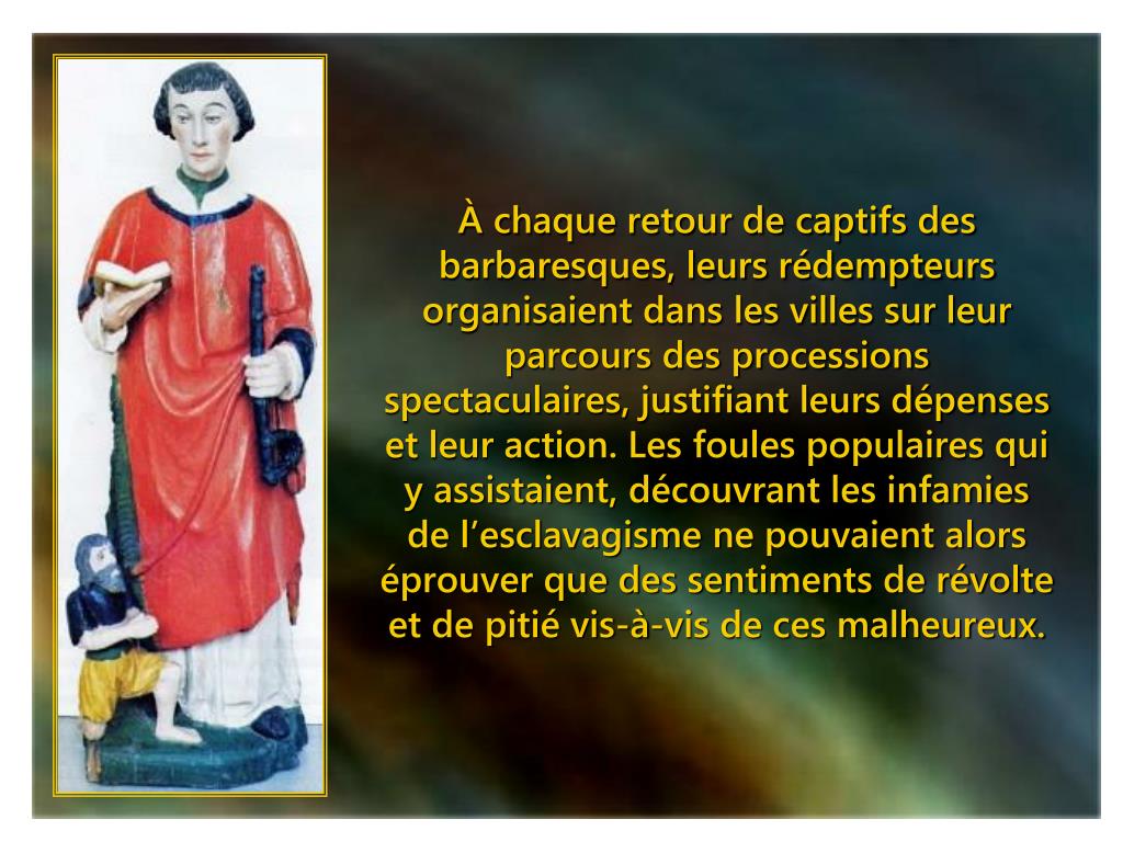 À chaque retour de captifs des barbaresques, leurs rédempteurs organisaient dans les villes sur leur parcours des processions spectaculaires, justifiant leurs dépenses et leur action. Les foules populaires qui y assistaient, découvrant les infamies de l’esclavagisme ne pouvaient alors éprouver que des sentiments de révolte et de pitié vis-à-vis de ces malheureux.