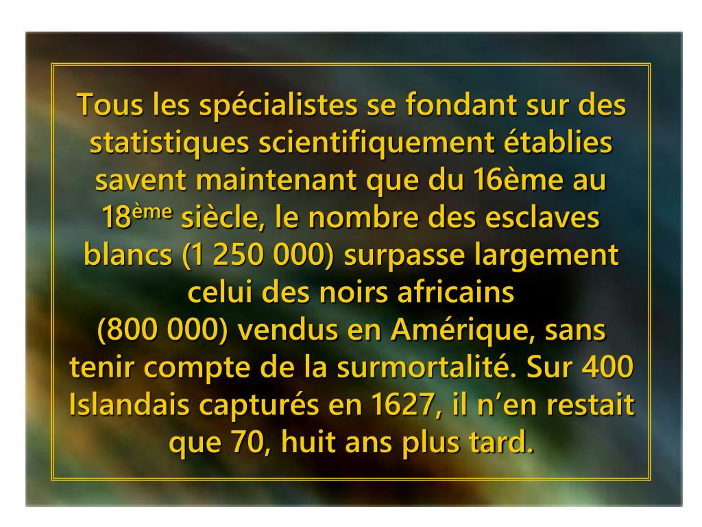 Tous les spécialistes se fondant sur des statistiques scientifiquement établies savent maintenant que du 16ème au 18ème siècle, le nombre des esclaves blancs (1 250 000) surpasse largement celui des noirs africains(800 000) vendus en Amérique, sans tenir compte de la surmortalité. Sur 400 Islandais capturés en 1627, il n’en restait que 70, huit ans plus tard.