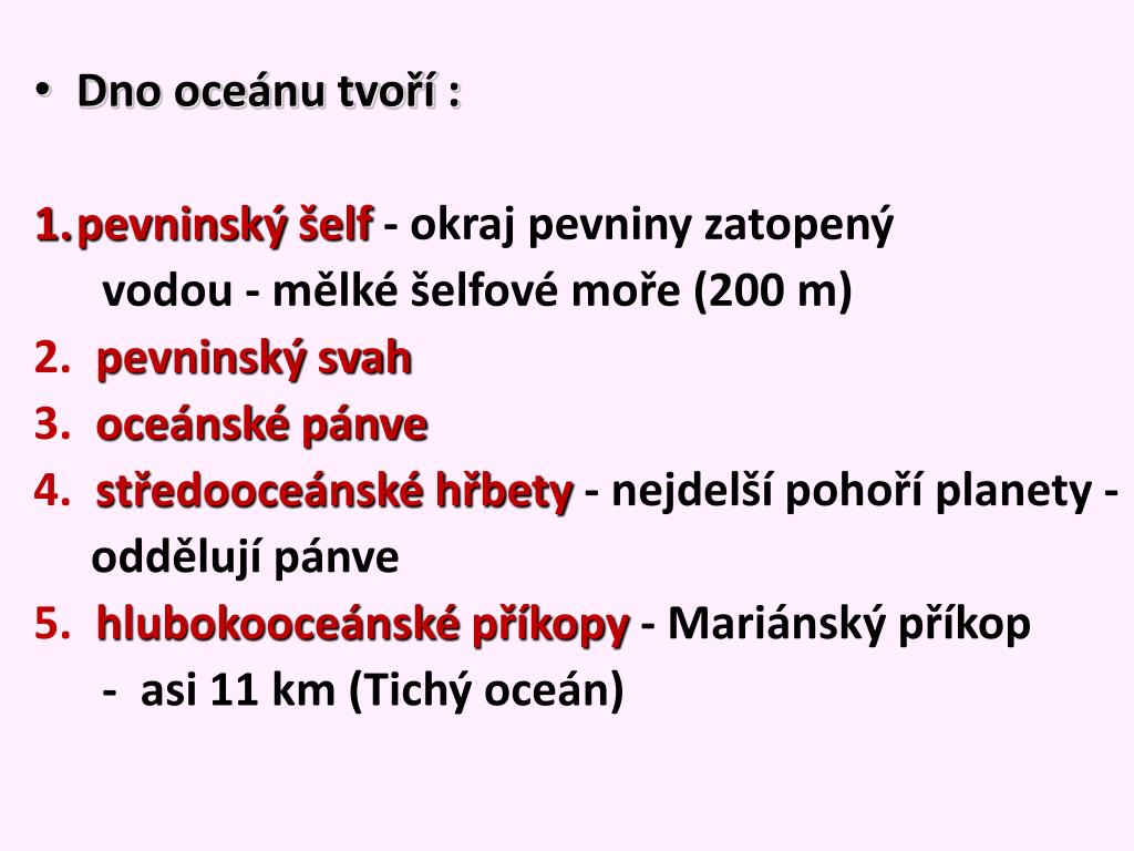 Dno oceánu tvoří : • pevninskýšelf - okraj pevniny zatopený vodou - mělké šelfové moře (200 m) 2.pevninskýsvah 3.oceánsképánve 4.středooceánskéhřbety - nejdelší pohoří planety - oddělují pánve 5.hlubokooceánsképříkopy - Mariánský příkop - asi 11 km (Tichý oceán)