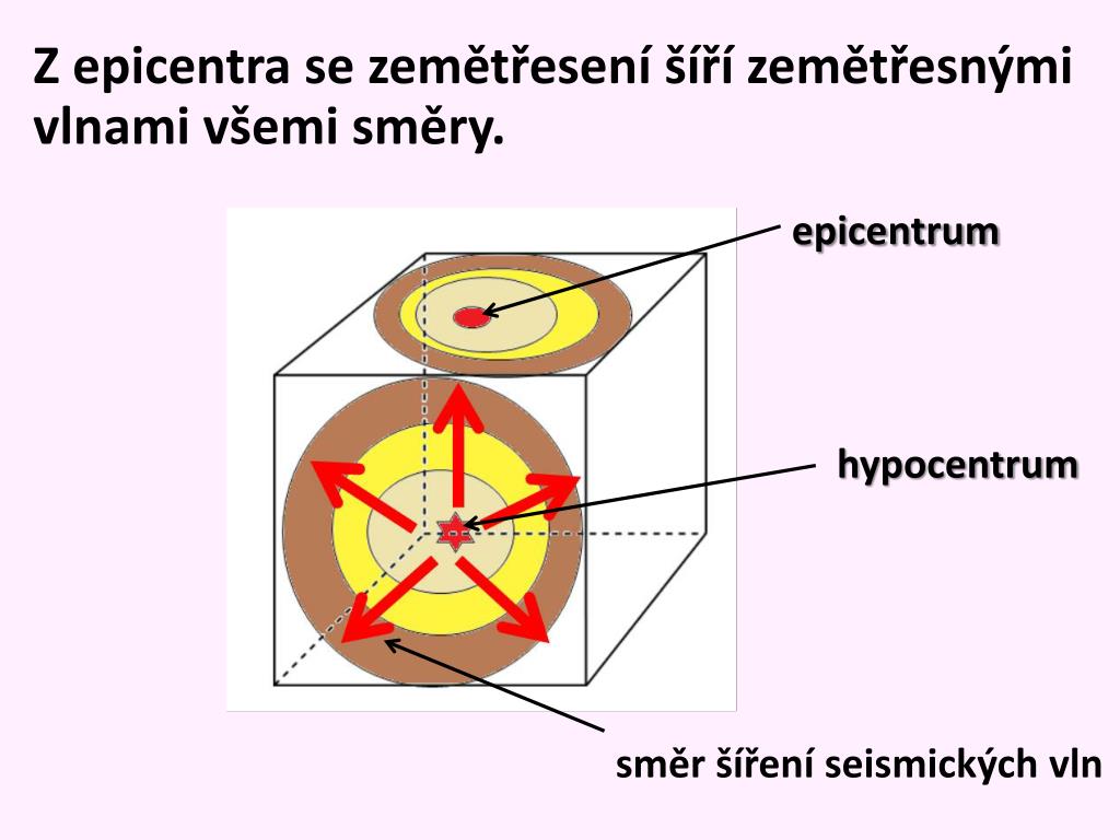 Z epicentra se zemětřesení šíří zemětřesnými vlnami všemi směry. epicentrum hypocentrum směr šíření seismických vln