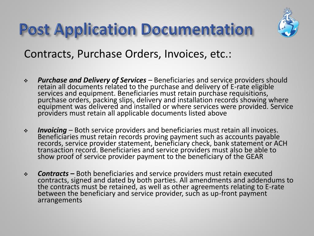 Post Application Documentation Contracts, Purchase Orders, Invoices, etc.: • Purchase and Delivery of Services –Beneficiaries and service providers should retain all documents related to the purchase and delivery of E-rate eligible services and equipment. Beneficiaries must retain purchase requisitions, purchase orders, packing slips, delivery and installation records showing where equipment was delivered and installed or where services were provided. Service providers must retain all applicable documents listed above • Invoicing – Both service providers and beneficiaries must retain all invoices. Beneficiaries must retain records proving payment such as accounts payable records, service provider statement, beneficiary check, bank statement or ACH transaction record. Beneficiaries and service providers must also be able to show proof of service provider payment to the beneficiary of the GEAR • Contracts –Both beneficiaries and service providers must retain executed contracts, signed and dated by both parties. All amendments and addendums to the contracts must be retained, as well as other agreements relating to E-rate between the beneficiary and service provider, such as up-front payment arrangements