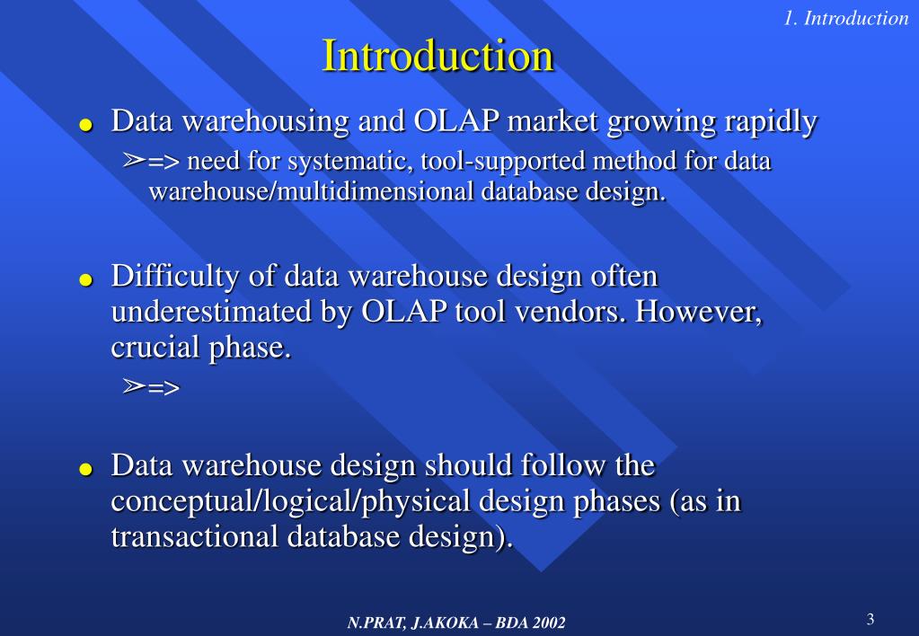 1. Introduction Introduction • Data warehousing and OLAP market growing rapidly • => need for systematic, tool-supported method for data warehouse/multidimensional database design. • Difficulty of data warehouse design often underestimated by OLAP tool vendors. However, crucial phase. • => • Data warehouse design should follow the conceptual/logical/physical design phases (as in transactional database design).
