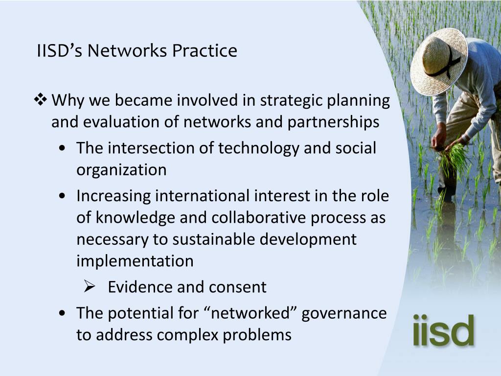 IISD’s Networks Practice • Why we became involved in strategic planning and evaluation of networks and partnerships • The intersection of technology and social organization • Increasing international interest in the role of knowledge and collaborative process as necessary to sustainable development implementation • Evidence and consent • The potential for “networked” governance to address complex problems