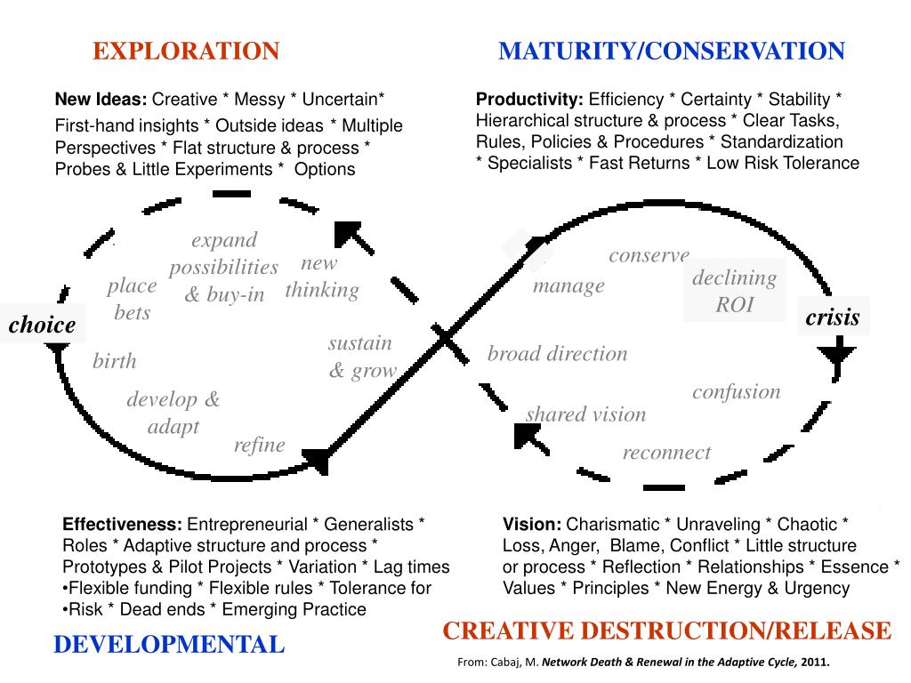 EXPLORATION MATURITY/CONSERVATION New Ideas: Creative * Messy * Uncertain* First-hand insights * Outside ideas* Multiple Perspectives * Flat structure & process * Probes & Little Experiments * Options • Productivity: Efficiency * Certainty * Stability * • Hierarchical structure & process * Clear Tasks, • Rules, Policies & Procedures * Standardization • * Specialists * Fast Returns * Low Risk Tolerance expand possibilities & buy-in conserve new thinking declining ROI place bets manage crisis choice sustain & grow broad direction birth confusion develop & adapt shared vision refine reconnect • Effectiveness: Entrepreneurial * Generalists * • Roles * Adaptive structure and process * • Prototypes & Pilot Projects * Variation * Lag times • Flexible funding * Flexible rules * Tolerance for • Risk * Dead ends * Emerging Practice Vision: Charismatic * Unraveling * Chaotic * Loss, Anger, Blame, Conflict * Little structure or process * Reflection * Relationships * Essence * Values * Principles * New Energy & Urgency CREATIVE DESTRUCTION/RELEASE DEVELOPMENTAL From: Cabaj, M. Network Death & Renewal in the Adaptive Cycle, 2011.