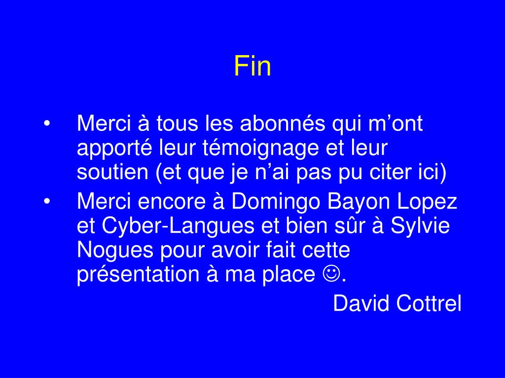 Fin • Merci à tous les abonnés qui m’ont apporté leur témoignage et leur soutien (et que je n’ai pas pu citer ici) • Merci encore à Domingo Bayon Lopez et Cyber-Langues et bien sûr à Sylvie Nogues pour avoir fait cette présentation à ma place . David Cottrel
