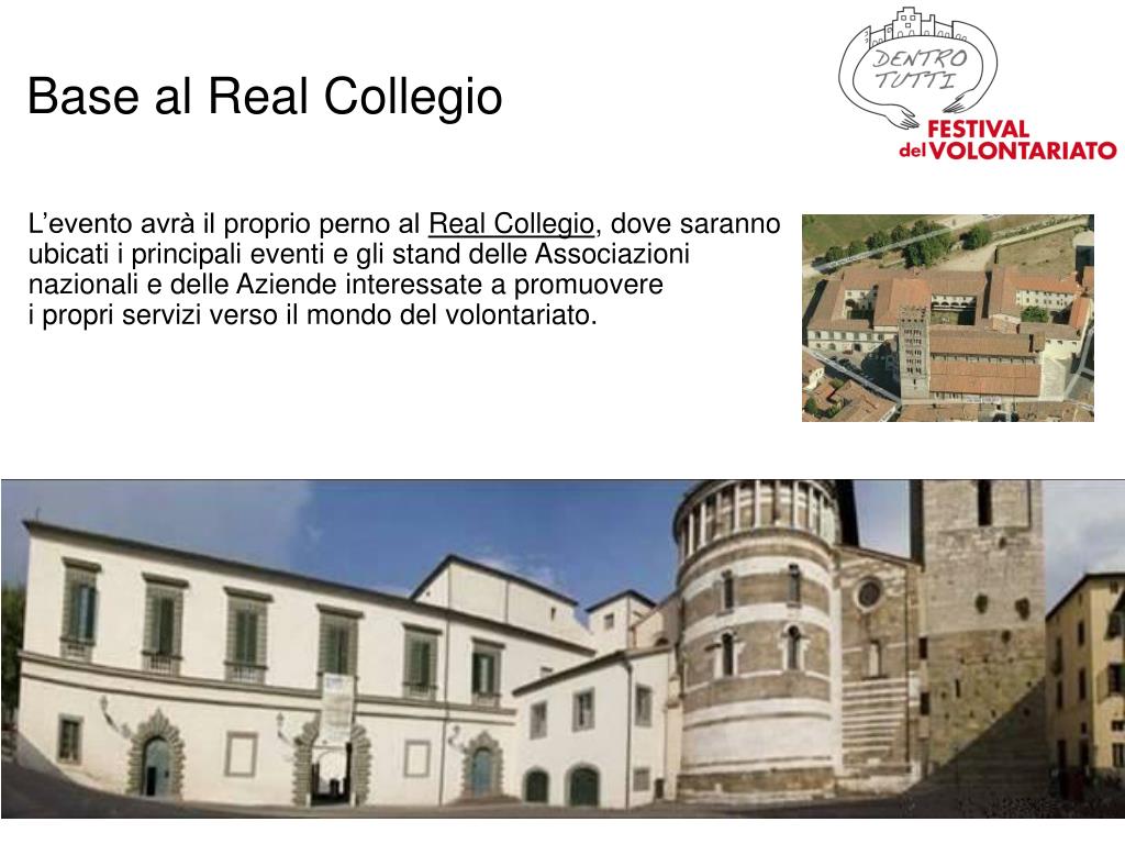 6. Base al Real Collegio L’evento avrà il proprio perno al Real Collegio, dove saranno ubicati i principali eventi e gli stand delle Associazioni nazionali e delle Aziende interessate a promuovere i propri servizi verso il mondo del volontariato.