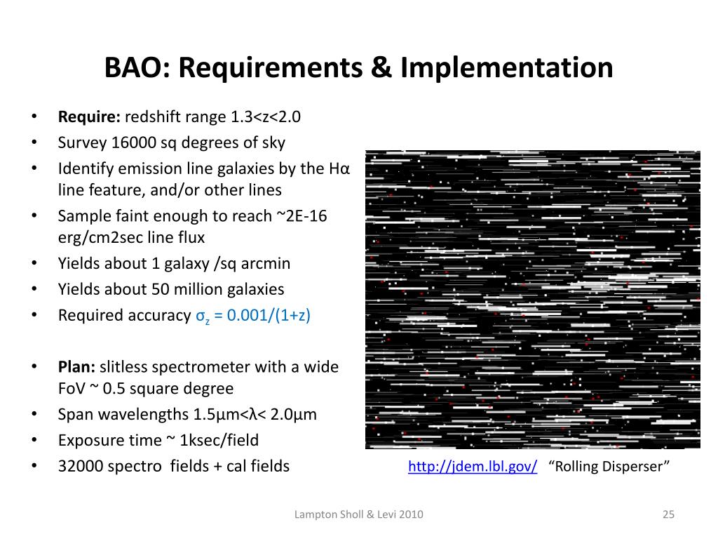 BAO: Requirements & Implementation • Require: redshift range 1.3<z<2.0 • Survey 16000 sq degrees of sky • Identify emission line galaxies by the Hα line feature, and/or other lines • Sample faint enough to reach ~2E-16 erg/cm2sec line flux • Yields about 1 galaxy /sq arcmin • Yields about 50 million galaxies • Required accuracy σz = 0.001/(1+z) • Plan: slitless spectrometer with a wide FoV ~ 0.5 square degree • Span wavelengths 1.5µm<λ< 2.0µm • Exposure time ~ 1ksec/field • 32000 spectro fields + cal fields http://jdem.lbl.gov/ “Rolling Disperser” Lampton Sholl & Levi 2010
