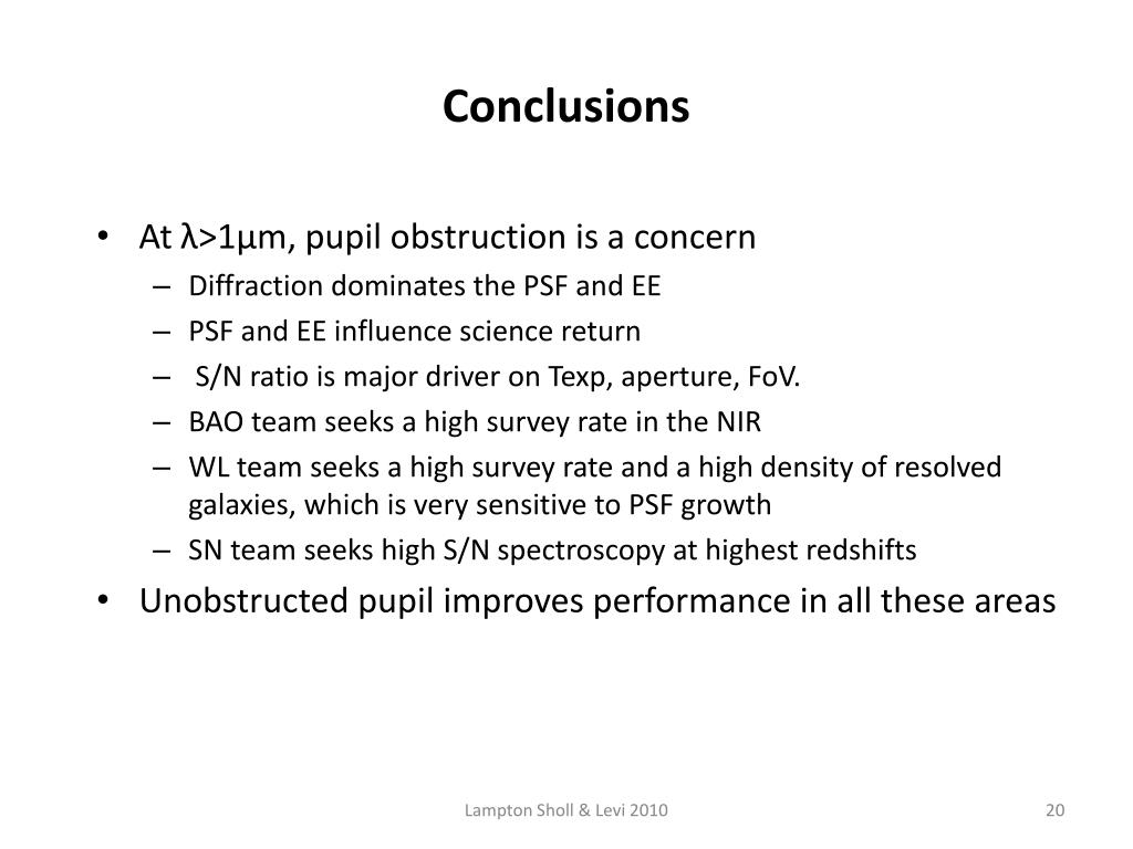 Conclusions • At λ>1µm, pupil obstruction is a concern • Diffraction dominates the PSF and EE • PSF and EE influence science return • S/N ratio is major driver on Texp, aperture, FoV. • BAO team seeks a high survey rate in the NIR • WL team seeks a high survey rate and a high density of resolved galaxies, which is very sensitive to PSF growth • SN team seeks high S/N spectroscopy at highest redshifts • Unobstructed pupil improves performance in all these areas Lampton Sholl & Levi 2010
