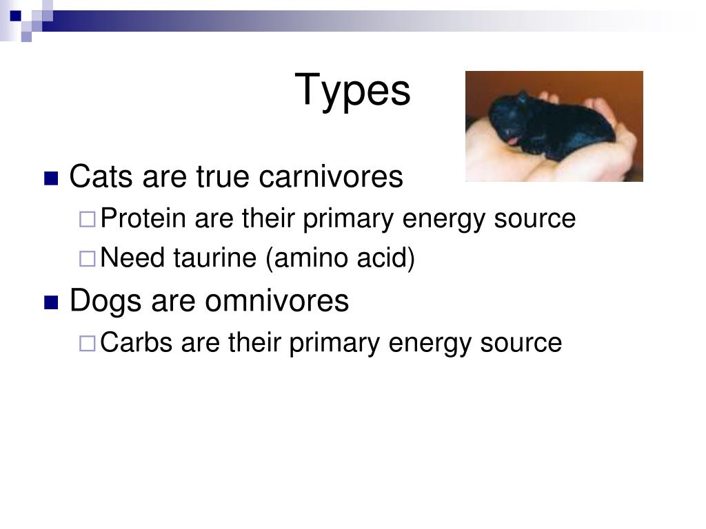 Types • Cats are true carnivores • Protein are their primary energy source • Need taurine (amino acid) • Dogs are omnivores • Carbs are their primary energy source