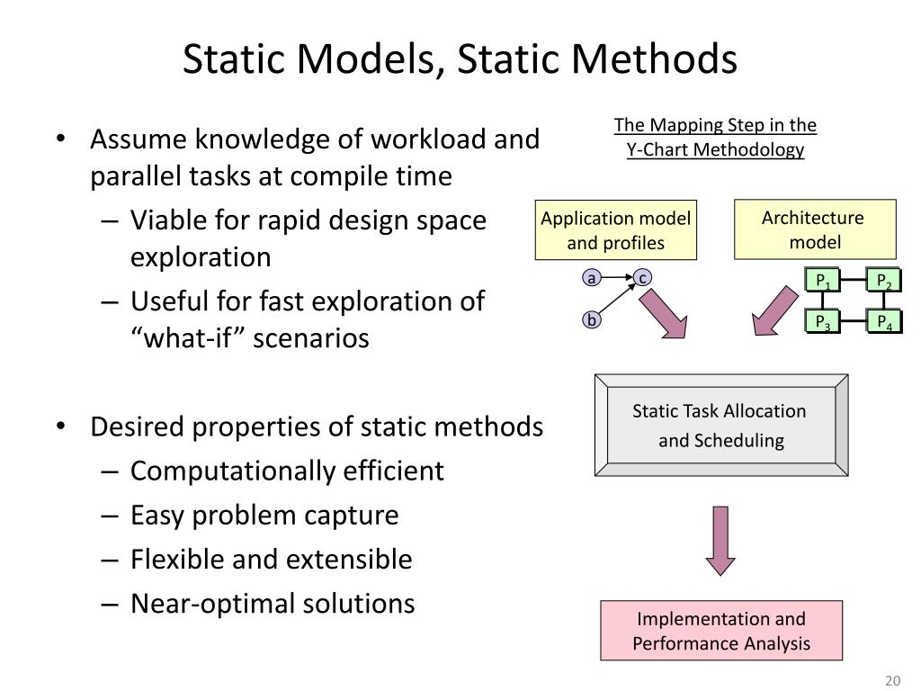 Static Models, Static Methods c a b The Mapping Step in the Y-Chart Methodology • Assume knowledge of workload and parallel tasks at compile time • Viable for rapid design space exploration • Useful for fast exploration of “what-if” scenarios • Desired properties of static methods • Computationally efficient • Easy problem capture • Flexible and extensible • Near-optimal solutions Architecture model Application model and profiles P1 P2 P3 P4 Static Task Allocation and Scheduling Implementation and Performance Analysis