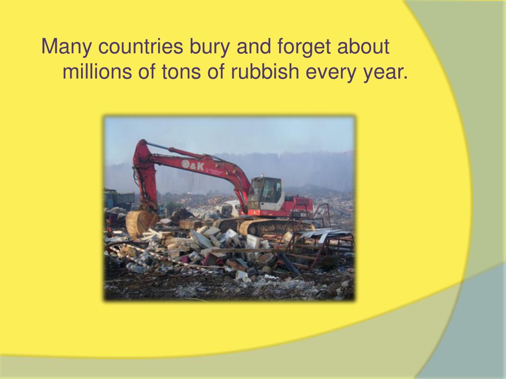 W hy thr o w away so much? . Many countries bury and forget about millions of tons of rubbish every year. In our town there are no recycling centers that’s why we bury litter .