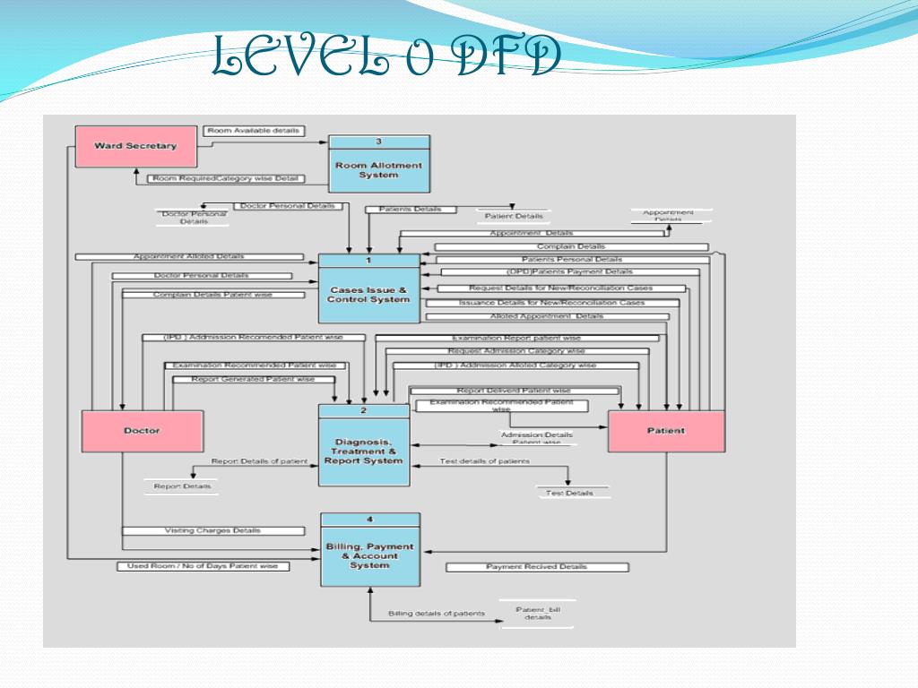 Level 0 DFD External Entities: • Ward Secretary • Doctor • Patient Processes: • Cases Issue & Control System • Diagnosis, Treatment & Report System • Room Allotment System • Billing, payment & Account system Data Store: • Doctor Personal Details • Patient Details • Appointment Details • Admission Details • Report Details • Test Details • Patient Bill Details