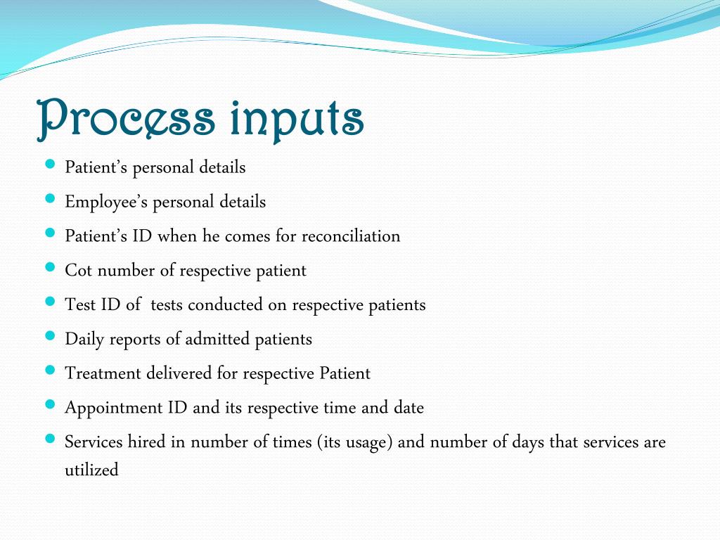 Process inputs • Patient’s personal details • Employee’s personal details • Patient’s ID when he comes for reconciliation • Cot number of respective patient • Test ID of tests conducted on respective patients • Daily reports of admitted patients • Treatment delivered for respective Patient • Appointment ID and its respective time and date • Services hired in number of times (its usage) and number of days that services are utilized