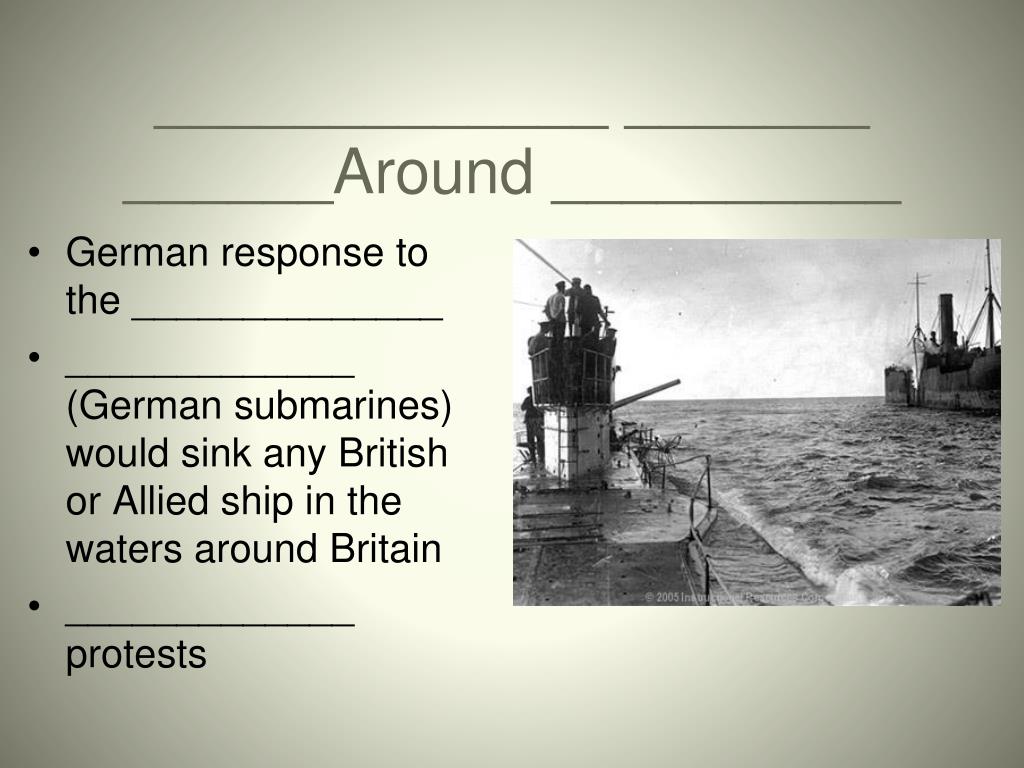 _____________ _______ ______Around __________ • German response to the ______________ • _____________ (German submarines) would sink any British or Allied ship in the waters around Britain • _____________ protests
