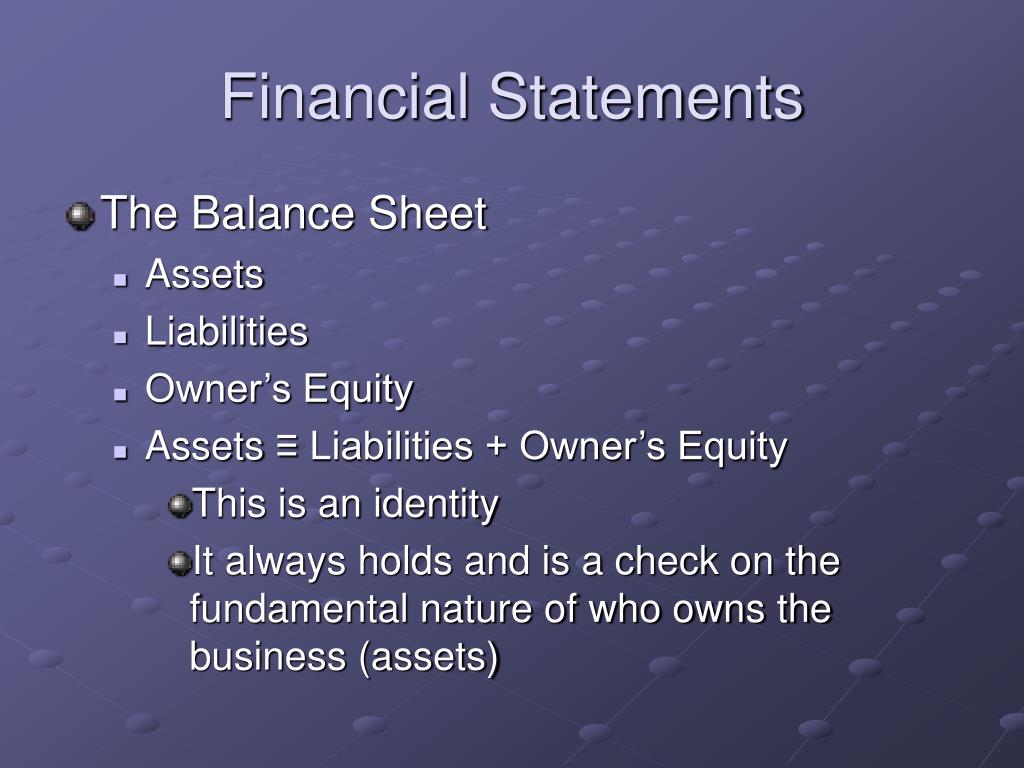 Financial Statements • The Balance Sheet • Assets • Liabilities • Owner’s Equity • Assets ≡ Liabilities + Owner’s Equity • This is an identity • It always holds and is a check on the fundamental nature of who owns the business (assets)
